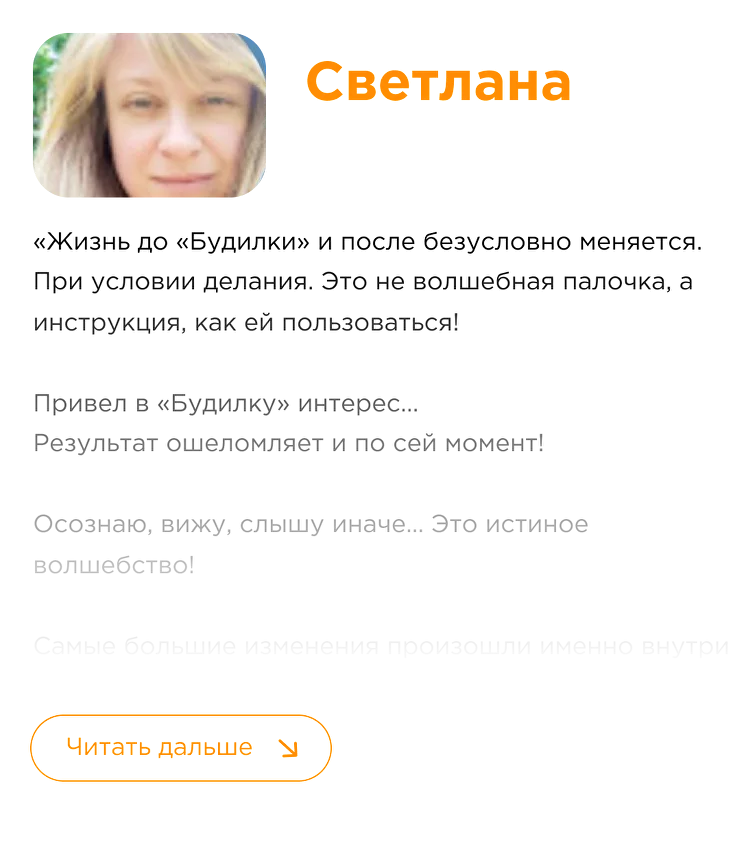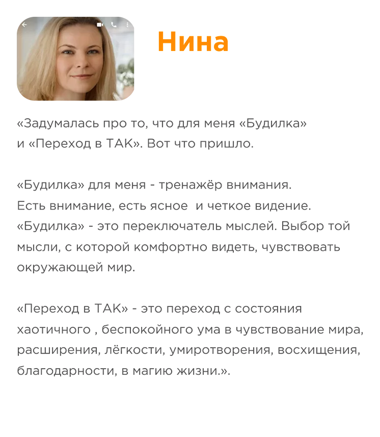 «Будилка» помогает нейтрализовать негативные программы. И как только вы определите для себя, как вы хотите теперь жить, вы сможете создать свой лучший мир. Мир, где всё так, как вы хотите. Даже если вокруг тревожно и небезопасно, то в вашем мире всегда все будет хорошо и так, как вы сами определите для себя.